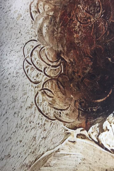 A detail of the painted self-portrait. Note the scratching in the wet paint layer, revealing the dark layer underneath.