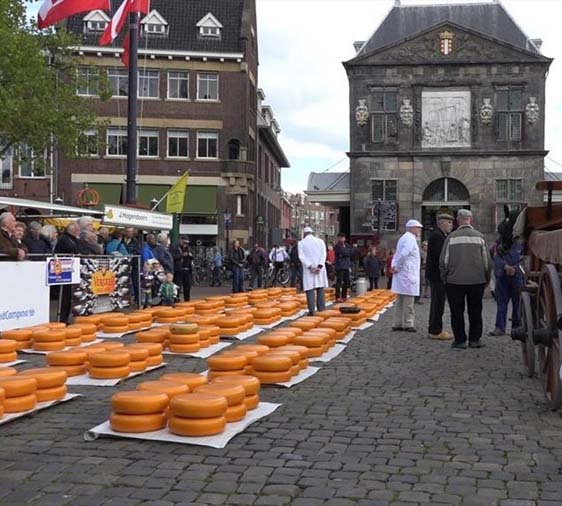 Gouda, cheese market in action. Note the enormous size and weight of 15 KG.