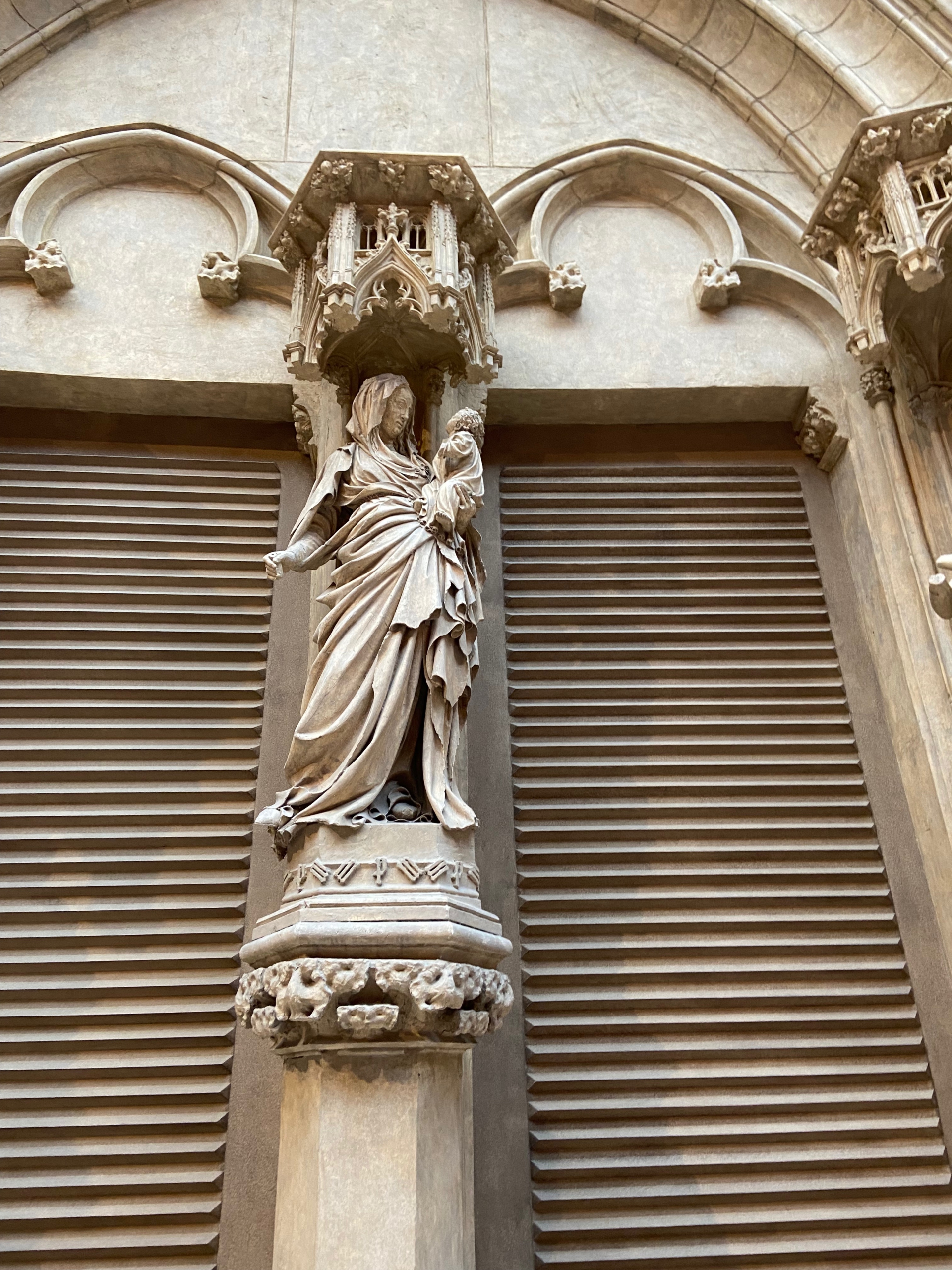 Central column: Mother Mary and Jesus child. Attributed to sculptor Jean de Marville.