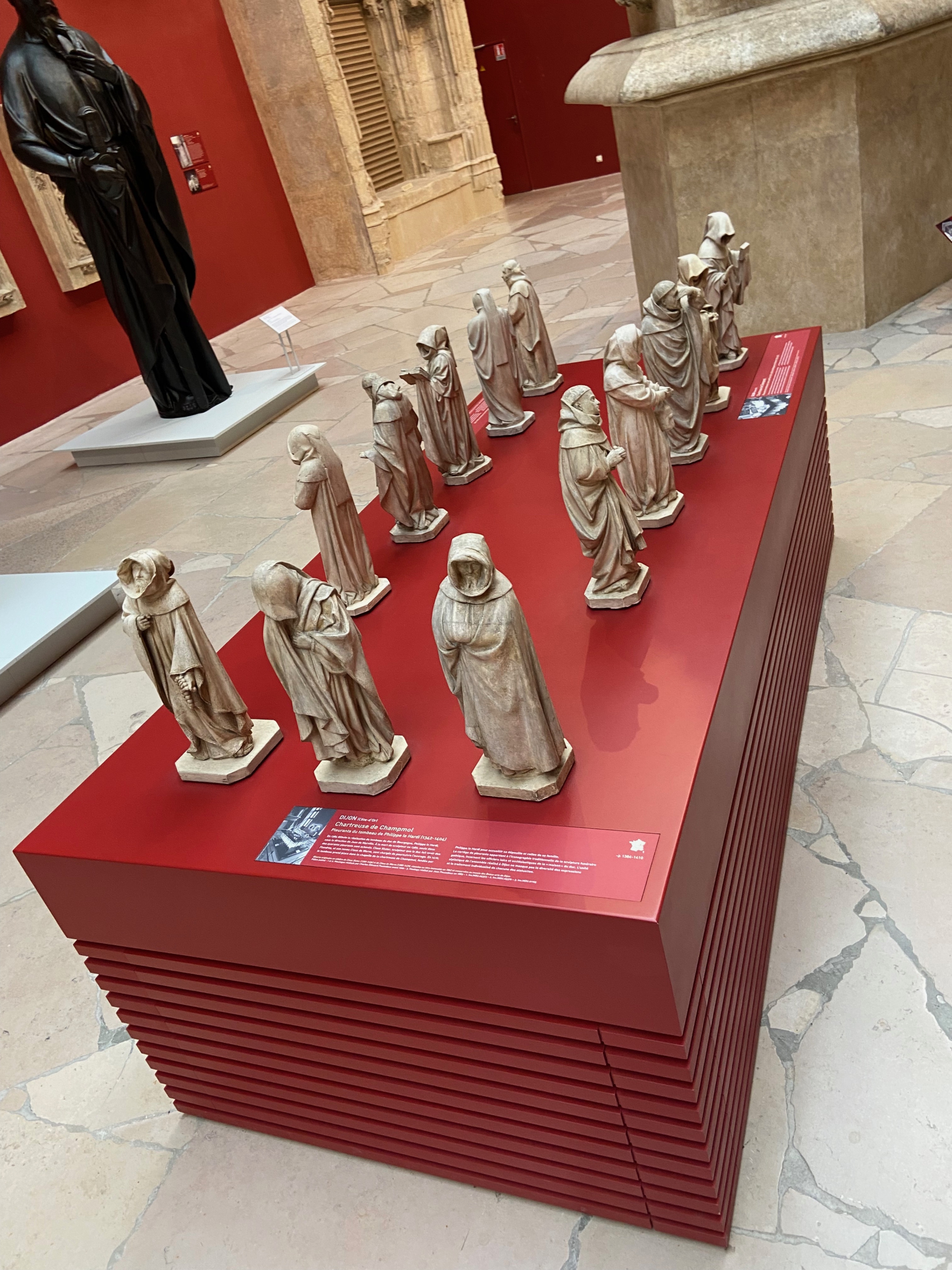 2.Two extravagant over lifesize funerary monuments now shown in the museum of Dijon, Musйe des Beaux-Arts. These were seriously attacked over the ages, especially during the French Revolution of 1798 – but the series of Mourners or Pleurants wrapped around the base have been saves -are still mostly there and a number of the Mourners are firmly ascribed to Sluter. The dormant large figures on top of the monuments are later and quite imperfect recreations based on drawings and prints. See the complete series in Le musée des Monuments français