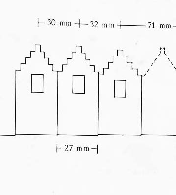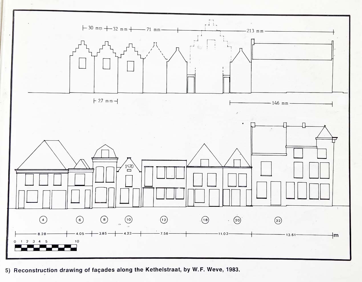 1.Vermeer painted a few innocuous houses behind the city wall to the middle left, with stepped gables. A few of these houses were still standing in 1983 and architectural historian Wim Weve made an exact drawing based on measurements. Kaldenbach also measured the scene and added the exact figures in millimeters on that published drawing shown here in full and in two details. On his drawing Kaldenbach erroneously added a facade plaque as 1670, whereas it should read 1570. The second digit was oddly formed and a house painter added too much black paint to the lower left, transforming the second digit 5 into seemingly a 6. City archivist Soutendam still got it right in 1867 when he prepared facts for a publication on city signs by J. van Lennep. But later researchers, including me, read it as 1670, as published in Artibus et Historiae, nr 6, 1982 (antedated!), page 15 in the paper ‘Vermeer’s View of Delft and his Vision of Reality’ by Arthur K. Wheelock and Kees Kaldenbach. The full article is here: https://www.academia.edu/9753123/Vermeers_View_of_Delft_and_his_Vision_of_Reality
